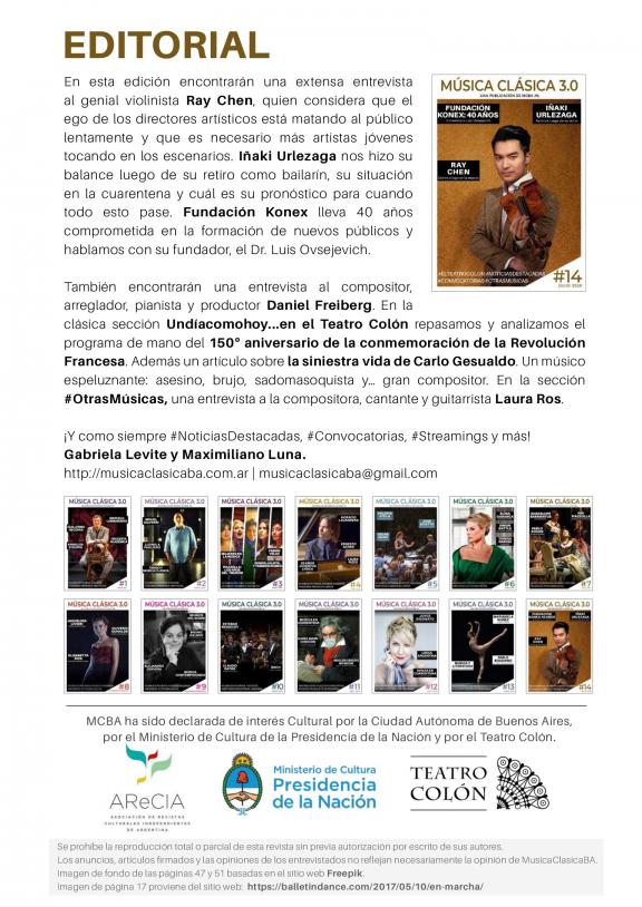 Música Cásica 3.0 es un publicación mensual con un enfoque más actual y desestructurado del mundo de la música clásica. En Música Clásica 3.0 encontrarán información de agenda, notas y entrevistas a artistas destacados.
