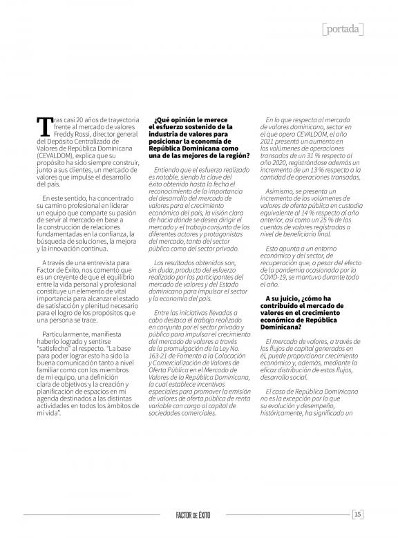 FACTOR DE ÉXITO es una revista de circulación bimestral y plataforma digital que ocupa un espacio relevante en la cobertura de los temas gerenciales y de negocios en República Dominicana, esto, apuntada al liderazgo empresarial, las mejores prácticas de negocio, las realidades de los diversos sectores económicos y las tendencias gerenciales y de mejoramiento profesional que contribuyan a elevar la calidad de la gestión empresarial.