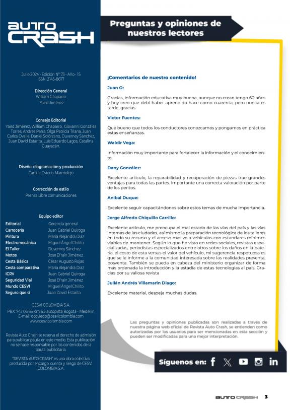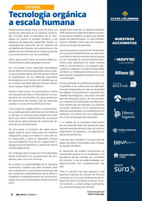 La Revista Auto Crash es la publicación editorial del Centro de Experimentación y Seguridad Vial CESVI COLOMBIA, con 20 años de trayectoria en la investigación de la cadena de valor del automóvil, vehículos pesados y motocicletas. Somos una revista independiente, generadora de opinión, y fuente de consulta para la industria automotriz