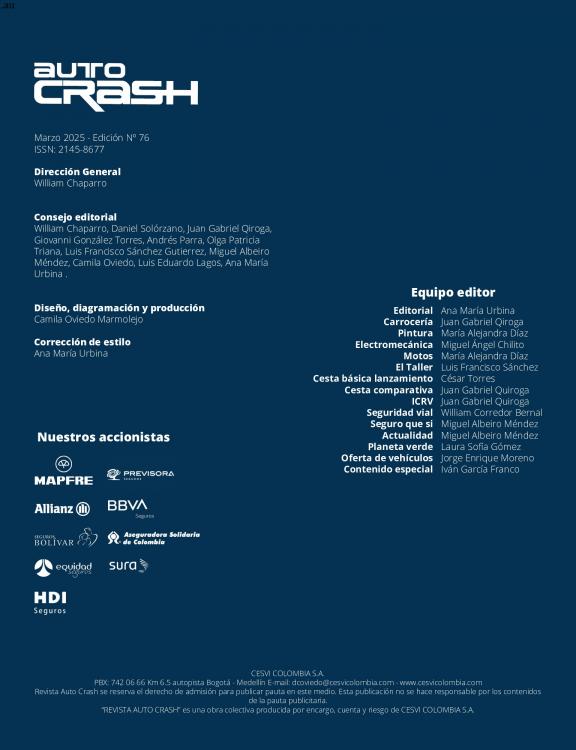 La Revista Auto Crash es la publicación editorial del Centro de Experimentación y Seguridad Vial CESVI COLOMBIA, con 20 años de trayectoria en la investigación de la cadena de valor del automóvil, vehículos pesados y motocicletas. Somos una revista independiente, generadora de opinión, y fuente de consulta para la industria automotriz